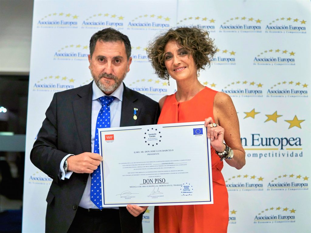 donpiso, una de las empresas de intermediación inmobiliaria más longevas a nivel nacional, ha recibido la Medalla de Oro al Mérito en el Trabajo. Esta condecoración, otorgada por la Asociación Europea de Economía y Competitividad (AEDEEC), es un reconocimiento a sus más de tres décadas de trabajo en el mercado inmobiliario. Y es que donpiso, a día de hoy, está extendida por toda España, con 113 oficinas y franquicias. Su equipo de trabajadores está formado por más de 600 personas y su volumen de operaciones supera los 450 millones de euros al año. La entrega del galardón tuvo lugar el viernes 18 de mayo en el Hotel Eurostars Suites Mirasierra de Madrid. El acto estuvo presidido por José Luis Barceló, presidente de la AEDEEC. Él fue quién entrego la medalla a Emiliano Bermúdez, subdirector general de donpiso. El acto fue cubierto por la periodista Ana García Lozano.